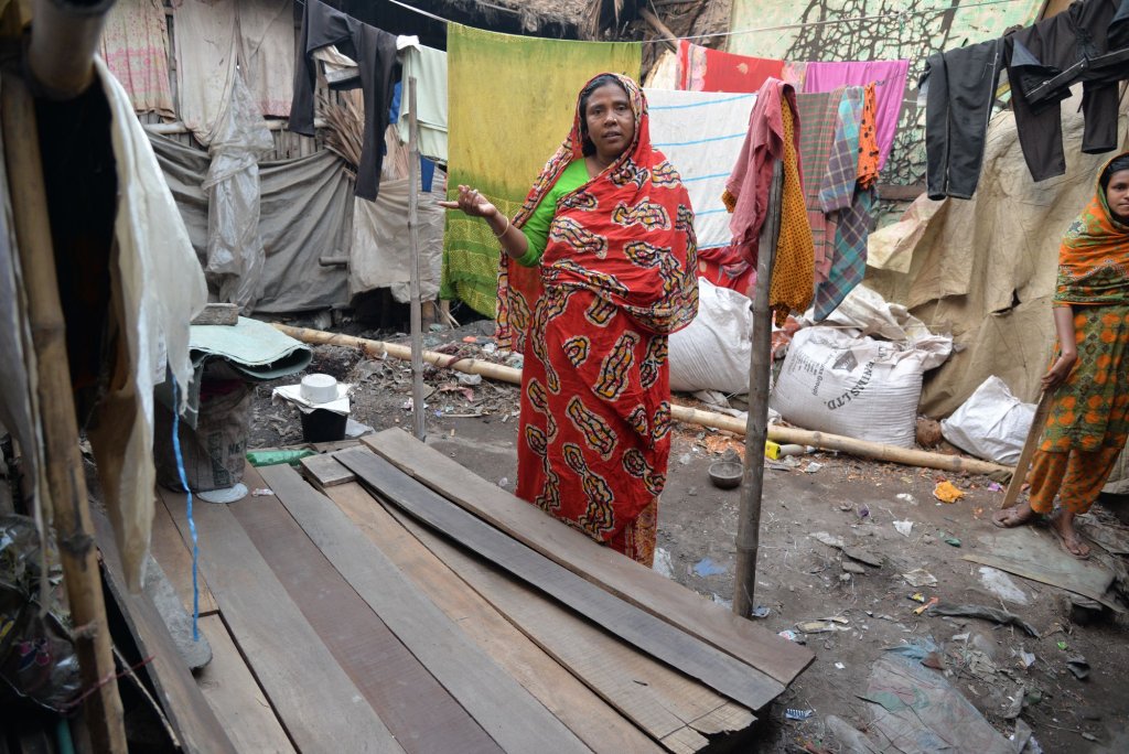 Teilweise mussten wir uns seitlich drehen, um uns zwischen den Hütten durchzuquetschen. Dann hielt Umme Begum an einer kleinen Freifläche an. „Hier lebt Kulsum“, sie zeigte auf den Boden. Da lagen neun bis zehn lose Holzbretter. Ein mit Papier zugedeckter Eimer war noch zu sehen und zwischen Schutt und Abfallresten lag noch eine kleine Tonschüssel. „Die großen Säcke und die Wäsche, die hier trocknet, gehören den Nachbarn“, erklärte Umme Begum. Hütte neben mir. Sie lebt allein. Ihr Mann hat sie verlassen. Als Haushaltshilfe verdiente sie etwas Geld. Dann, vor einem halben Jahr, ist sie bei der Arbeit gestürzt und hat sich die Beine gebrochen. Sie kann seitdem nicht mehr richtig gehen. Deshalb will sie auch niemand mehr beschäftigen. So hat sie die Miete nicht mehr bezahlen können und ist vom Eigentümer rausgeschmissen worden. Jetzt gerade ist Kulsum in der Innenstadt und versucht, durch Betteln an etwas Geld zu kommen. Wir Nachbarn versuchen, sie so gut wie es geht mit etwas Essen zu unterstützen. Ich habe ihr eine Plastikplane beschafft, damit sie bei Regen nicht nass wird und nachts wenigstens ein bisschen geschützt ist.“